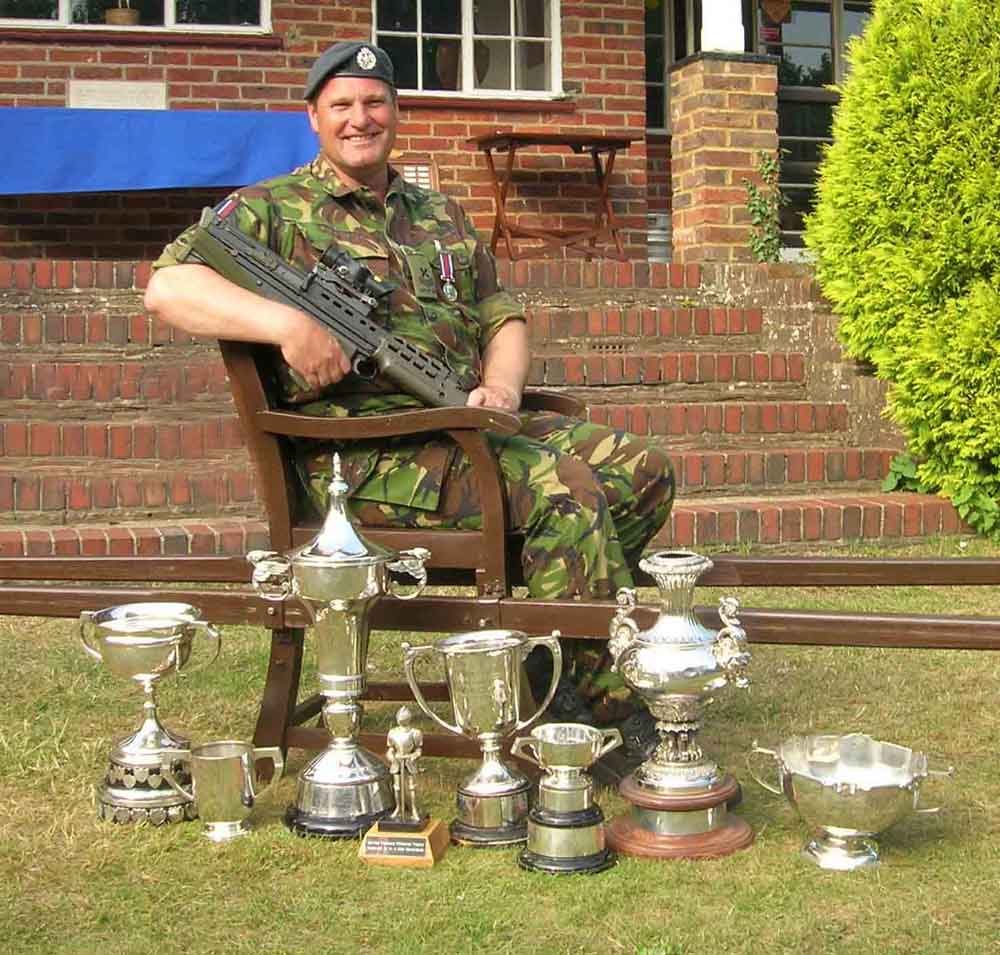On joining the Royal Air Force, his first attendance at Bisley was in 1979 where he won the RAF Target Rifle Championship outright. This did raise a few eyebrows as he was an unknown individual in a very large arena. Over the years he has won all major RAF shooting competitions including, Sub Machine Gun, Service Pistol, Target Rifle and the coveted Queen's Medal for Champion Shots of the Air Forces. He is the first RAF serviceman to have won every discipline.